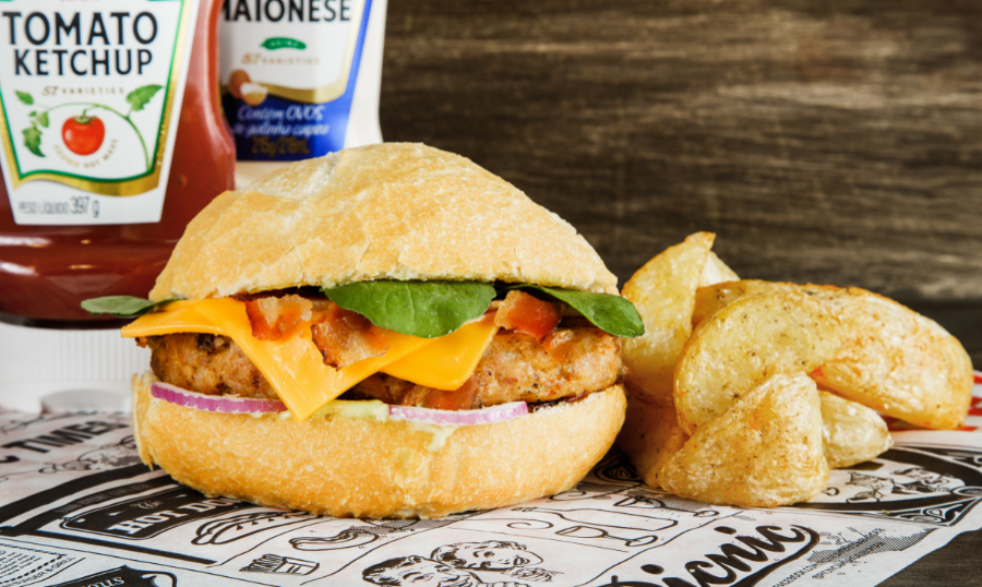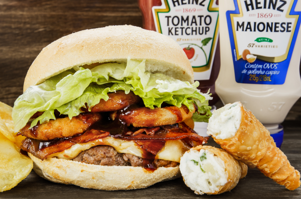 No Charles Burguer, o hamburguer é Charles Sweet Bacon, o pão de cervejinha, hambúrguer de contra filé, queijo emmental, bacon crocante caramelizado, molho chipotle, alface americana, tomate, cebola roxa e batata chips.