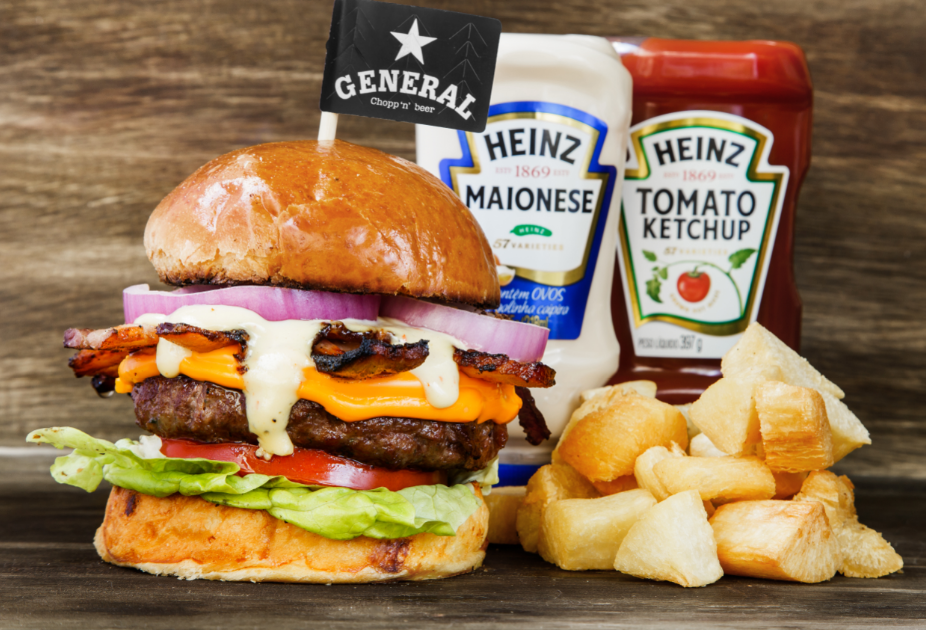 No General Chopp N Burguers , experimente o Chuck Norris- Pão de brioche, burger de costela 170g, alface lisa, tomate, cebola roxa, queijo cheddar, bacon grelhado, maionese caseira e hot sauce com aipim frito.